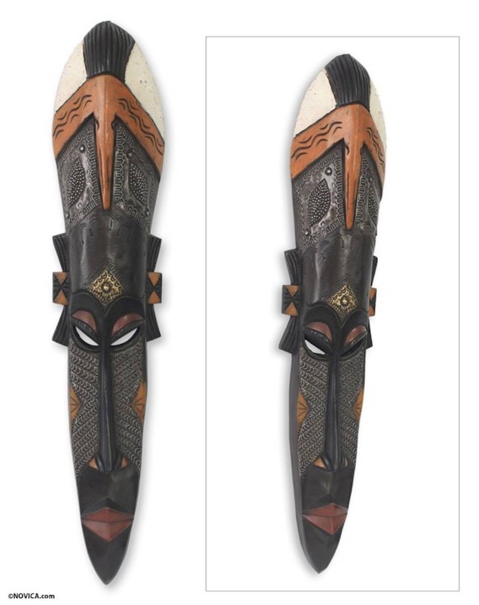 "Akan people present the 'Nhyira' mask to those who have contributed to their society. Meaning 'Blessings' in Twi, this long mask is crafted by Robert Nortey. He carves the sese wood replica by hand featuring an elaborate headdress with white clay and half-opened eyes. The brown mask is lavishly adorned with embossed aluminum and painted details."