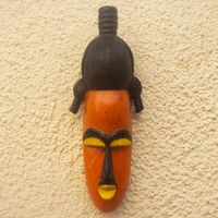 "Raphat Asigbey in Ghana designs a stunning mask with an oblong face and vivid colors. Ghanaian artisans carry out Raphat's vision by hand carving the mask from sese wood with local tools, then painting the surface in bright orange and yellow with contrasting black."
