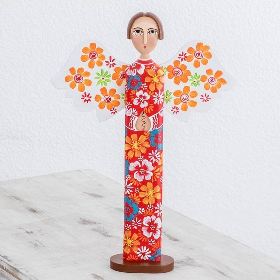 Hand Carved and Painted Colorful Floral Angel Wood Statuette 'Love and Guidance in Red' Item ID: 2671776692