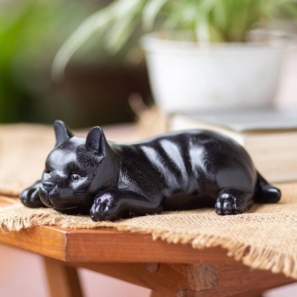 Hand-Carved Black Suar Wood Sculpture of a Sleepy Puppy 'Sleepy Paws' Item ID: 2671763081