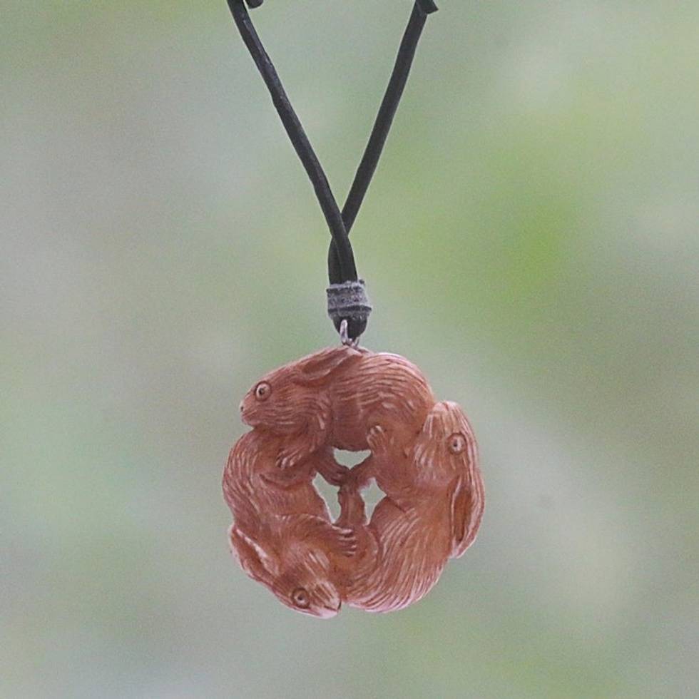 Hand-Carved Bone Rabbit Pendant Necklace from Bali 'Bunny Family' Item ID: 2671736158