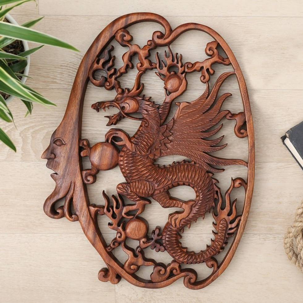 Hand-Carved Classic Suar Wood Moon and Dragon Relief Panel 'Regal Dragon' Item ID: 2671765250