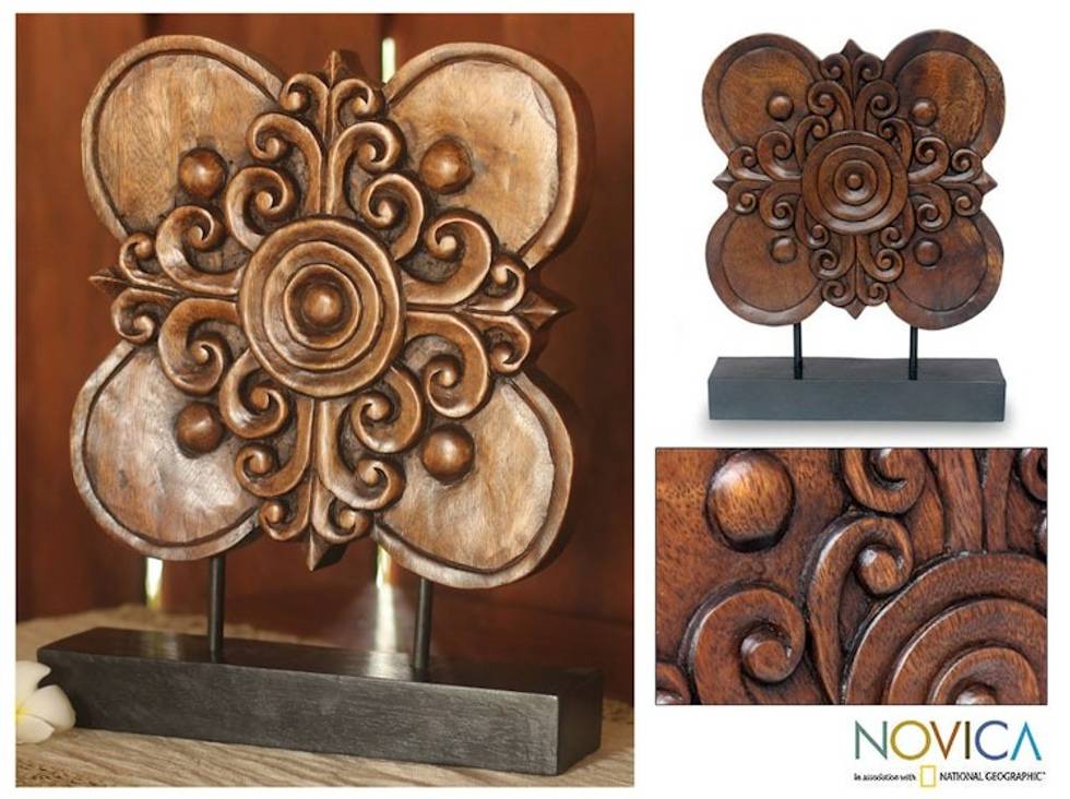 Hand Carved Floral Wood Sculpture 'Blossoming Shield' Item ID: 2671803170
