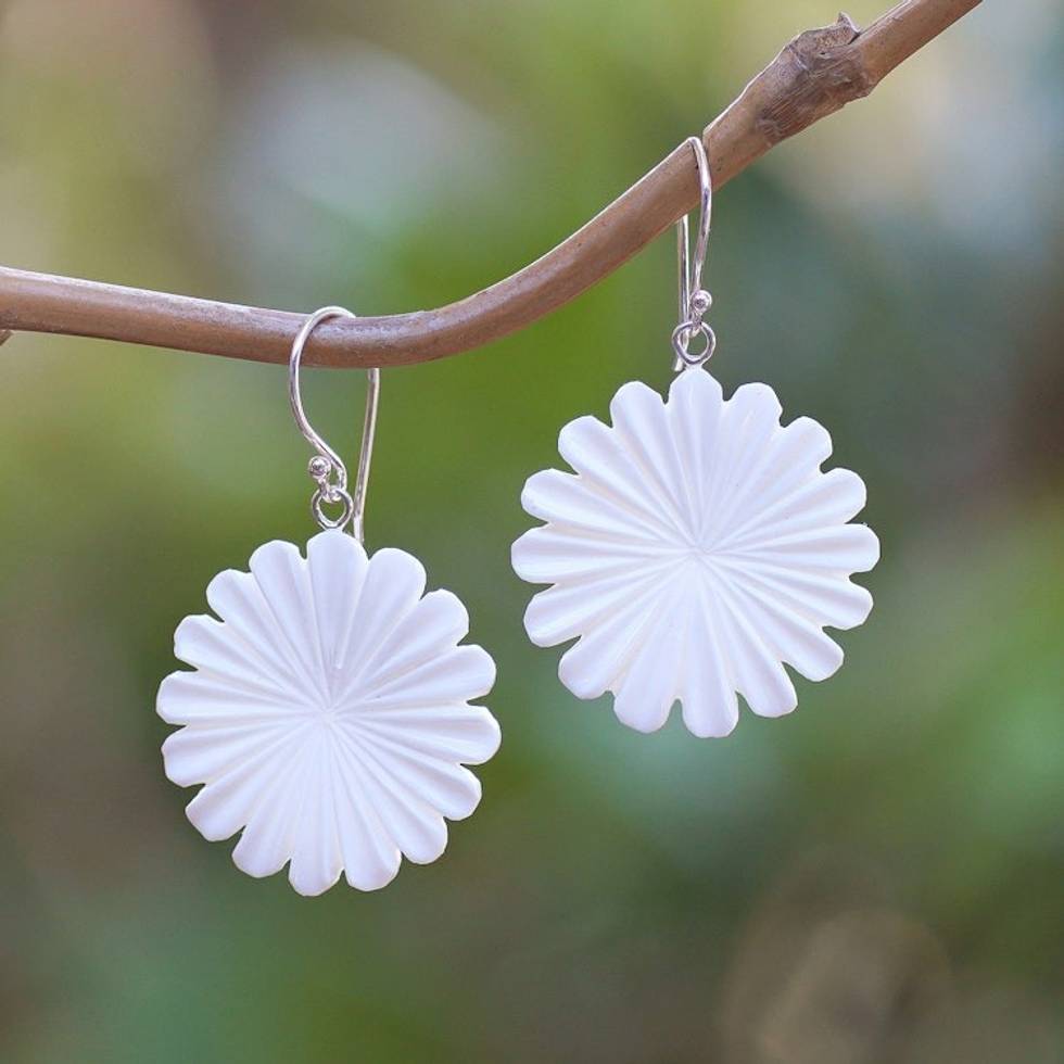 Hand-Carved Fresh Margot Bloom-Shaped Dangle Earrings 'Snowy Blooming Margot' Item ID: 2671765630