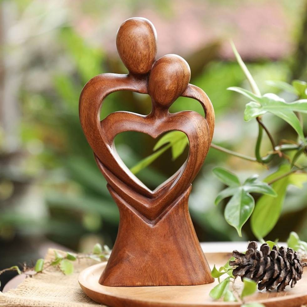 Hand-Carved Heart-Shaped Suar Wood Sculpture from Bali 'Morning Hugging' Item ID: 2671764545