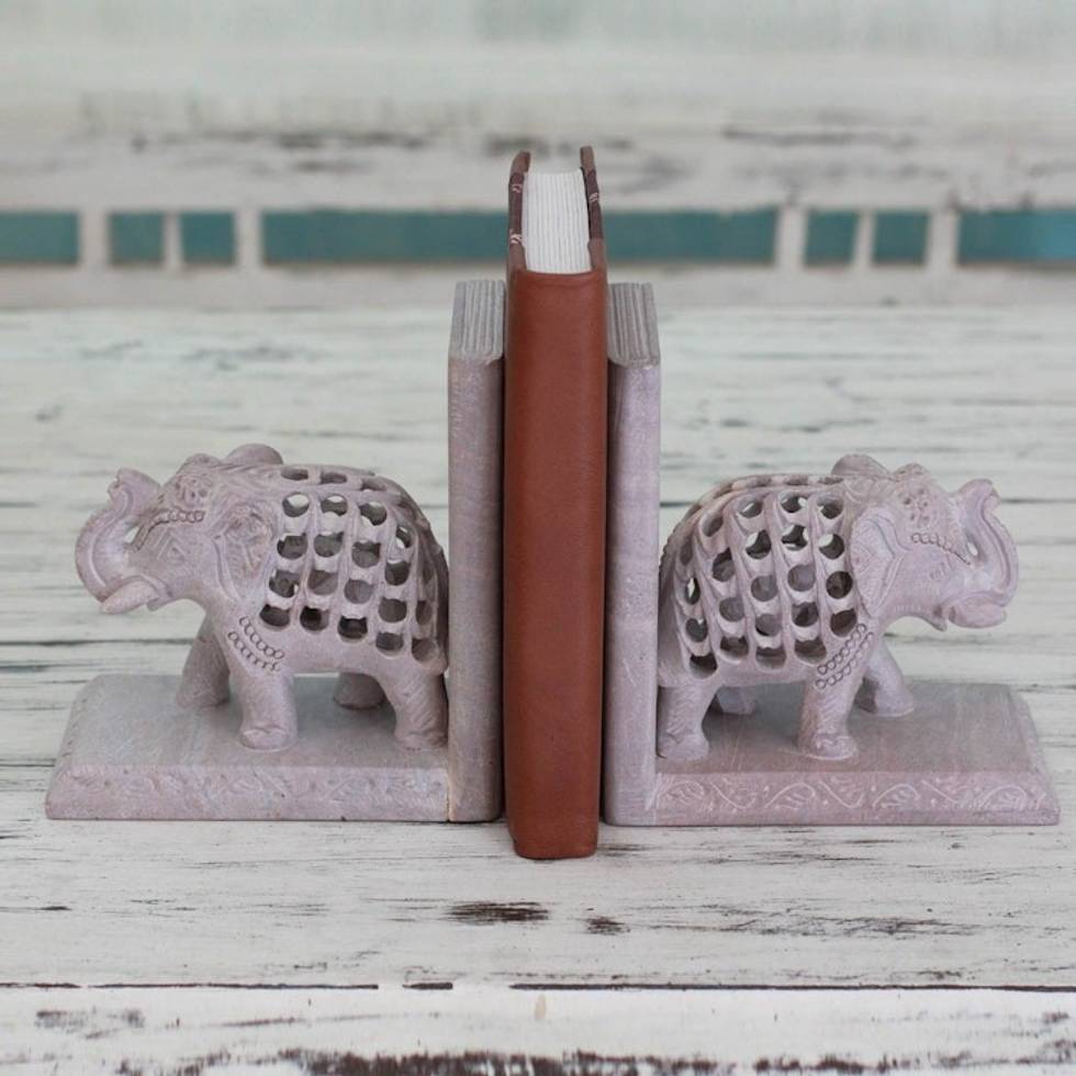 Hand Carved Indian Jali Soapstone Bookends 'Elephant Mom' Item ID: 2671793466