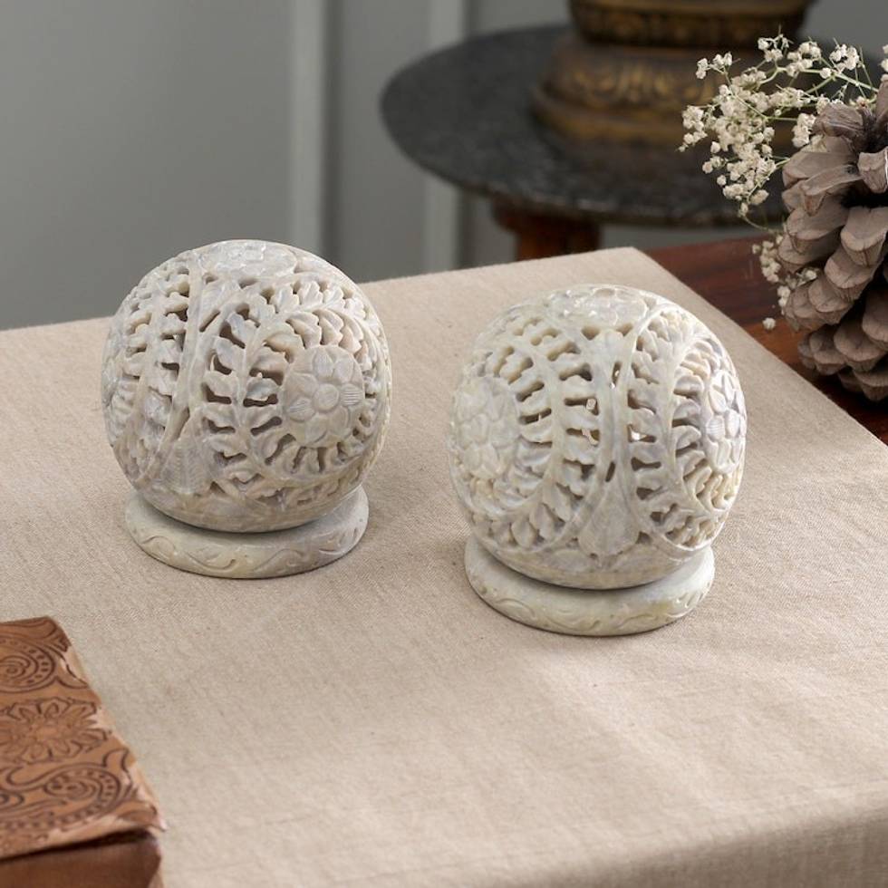 Hand Carved Jali Soapstone Candle Holders Pair 'World is a Flower' Item ID: 2671794841