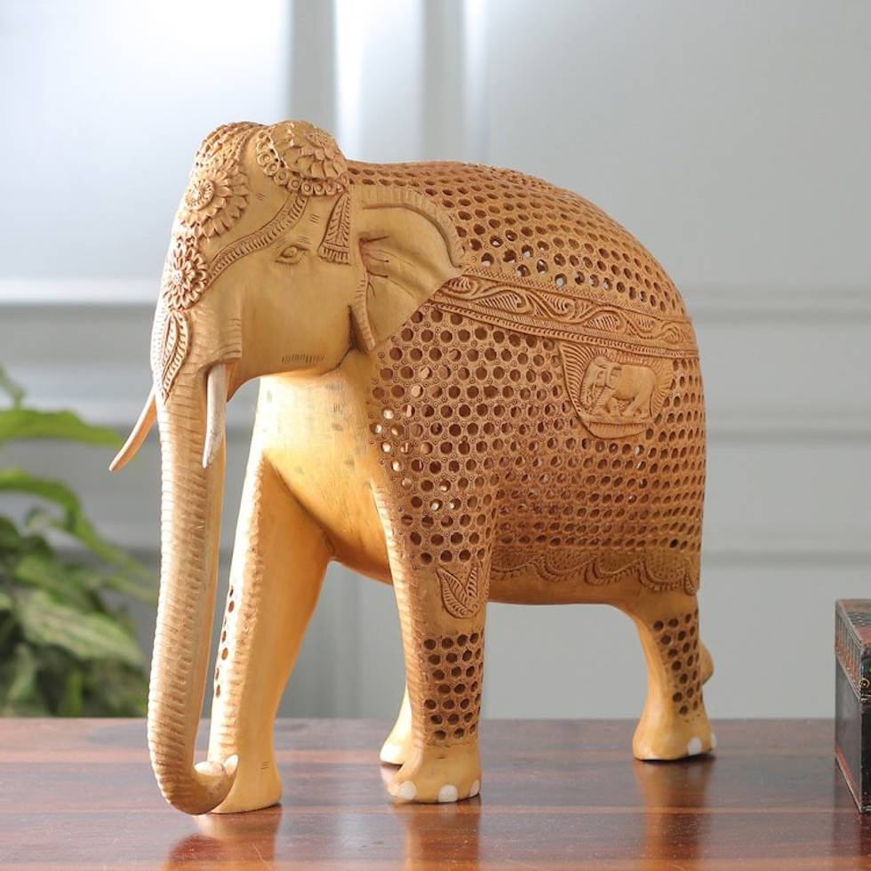 Hand-Carved Jali-Themed Haldu Wood Royal Elephant Sculpture 'Royal Elephant of Jali' Item ID: 2671781075