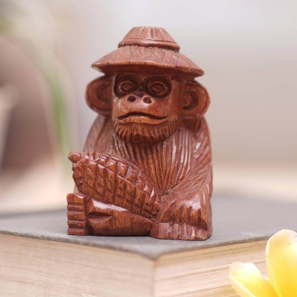 Hand-Carved Jempinis Wood Monkey Statuette with Corn 'Prosperity and Cunning' Item ID: 2671763188