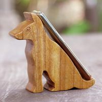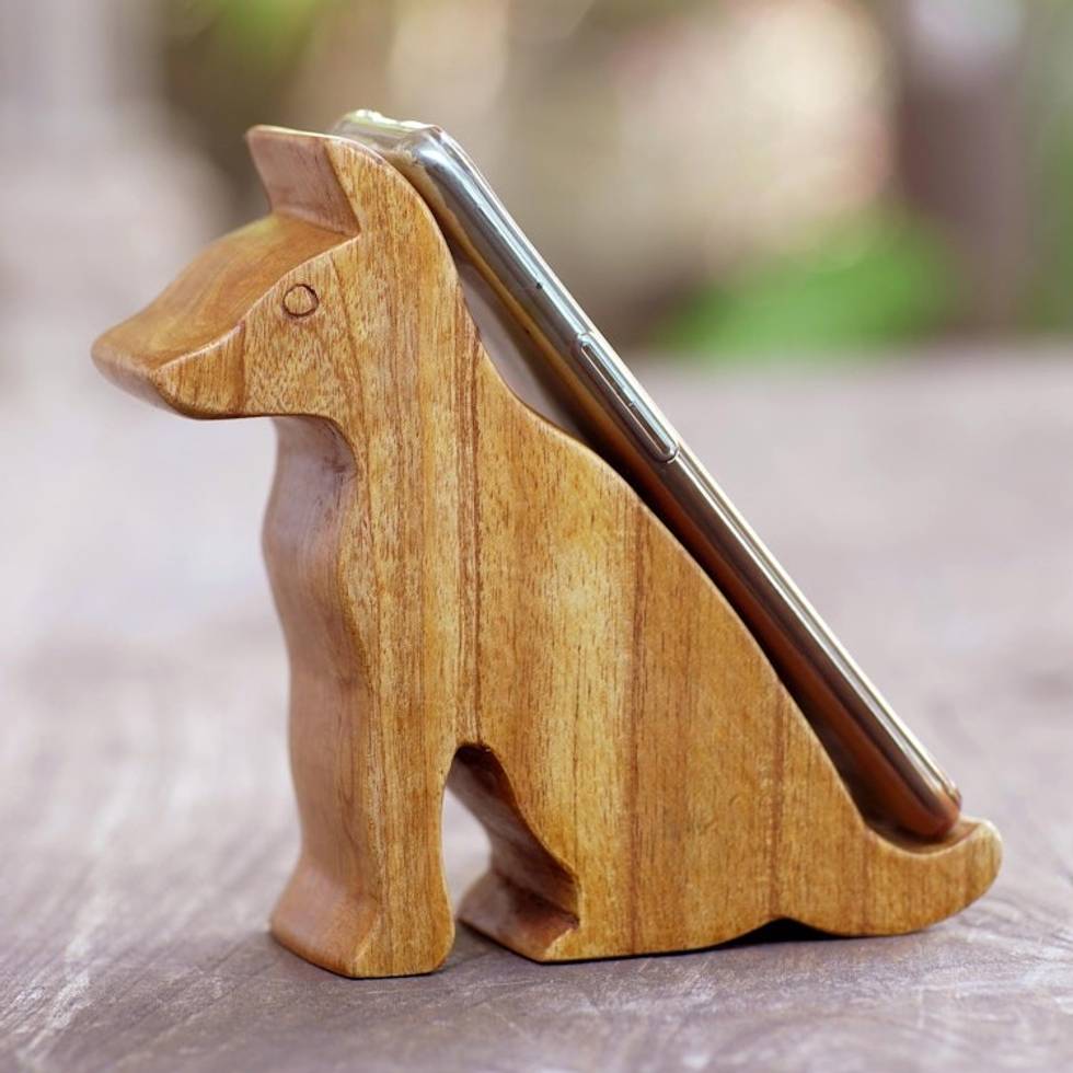 Hand Carved Jempinis Wood Phone Stand 'Dialing Dog' Item ID: 2669891944