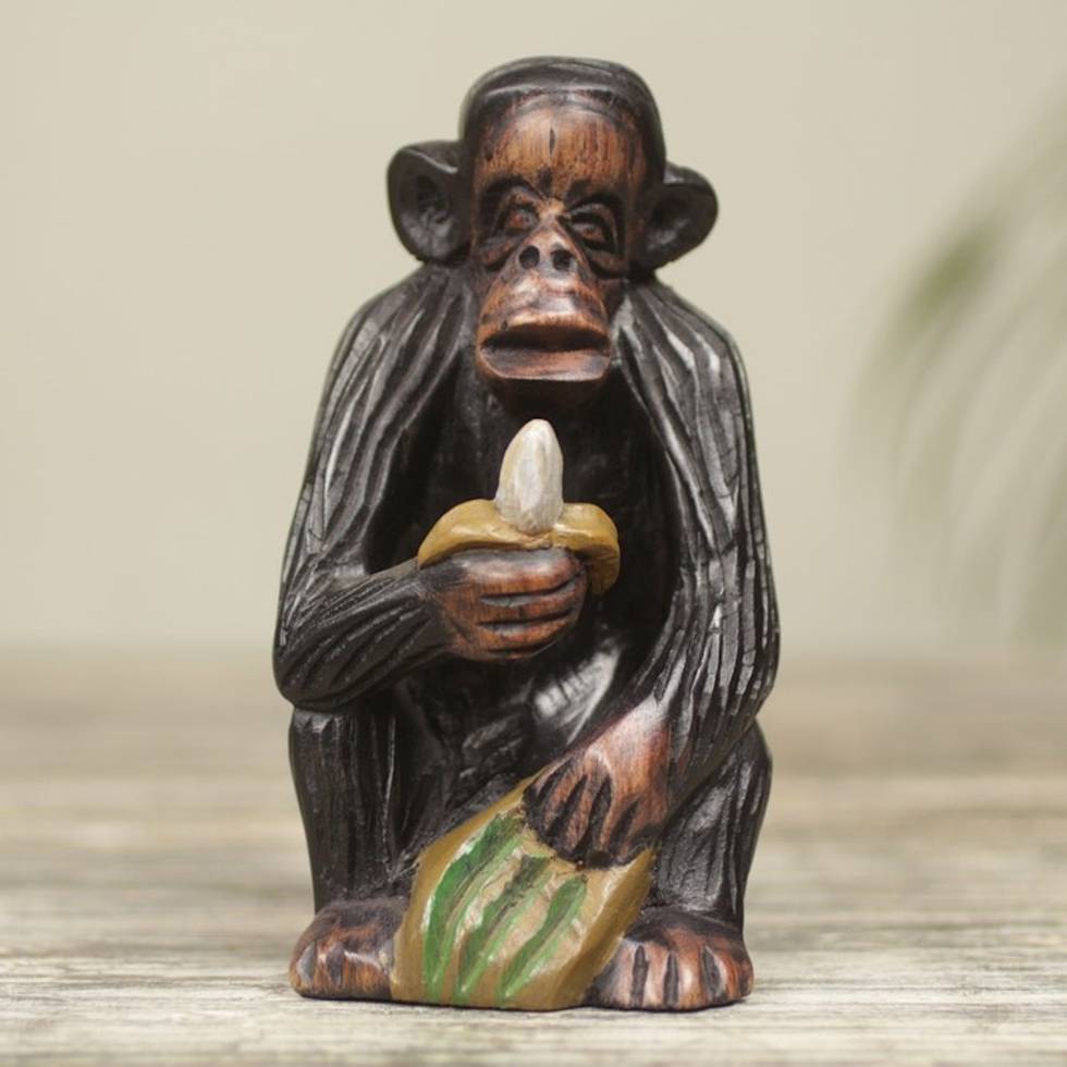 Hand Carved Monkey Theme African Ebony Sculpture 'Banana Snack' Item ID: 2671803845