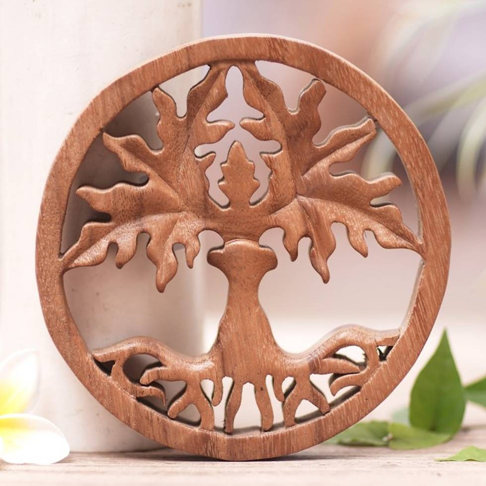 Hand-Carved Polished Brown Suar Wood Relief Panel from Bali 'Paradise Forest' Item ID: 2669891905