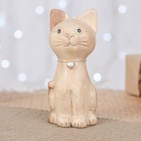 Hand-Carved Raintree Wood Cat Figurine with Aluminum Bell 'Feline Melody' Item ID: 2671641449