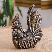 "Moo and Aud bring us a unique sculpture hand-carved in Thailand. This raintree wood chicken features black and gold tones, adding a luxurious touch to the piece. The final touch is in the little glass accents that make a glowing piece of art perfect for any environment."