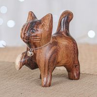 Hand-Carved Raintree Wood Happy Cat Figurine with Bell 'Melodic Steps' Item ID: 2671641623