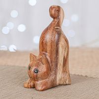 "After a day of sleep, this cheeky feline is ready for a moment of trouble and mischief, all starting with a long stretch. Thai artisan Patarawan honors these elegant creatures' cunning nature with this adorable raintree wood figurine, polished for a lustrous look."