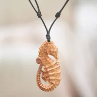 Hand-Carved Seahorse-Themed Cotton Cord Pendant Necklace 'Warrior of the Sea' Item ID: 2671670135