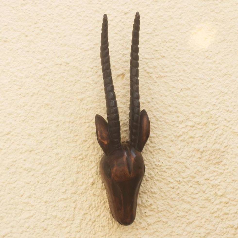 "Raphat Asigbey in Ghana designs this wonderful mask in the shape of an antelope's head with an impressive pair of horns. Ghanaian artisans hand carve the mask from local sese wood, paying special attention to the horns, then paint the surface in dark black and brown."