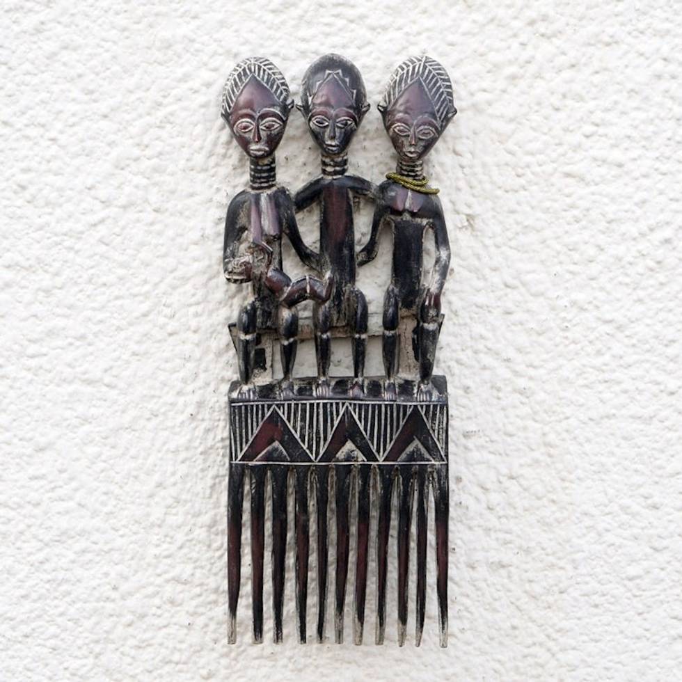 "In a departure from masks, Ghanaian artisan Philip Dankwa creates this comb-shaped wall decor at his workshop in the east of the country. Carving locally produced sese wood, Dankwa imagines a tribal triumvirate that sees two women, a baby and a man sitting in parallel. This comb-themed piece makes a grand entrance, even from afar, measuring nearly 22 inches in height."