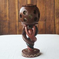 "Three pensive men hold the weight of the world on their shoulders in this singular sculpture by West Africa's Kwasi Asante. Hand crafted from local sese wood, the sculpture features three twisted figures in contrasting earthy hues holding a hole-filled globe above their heads."