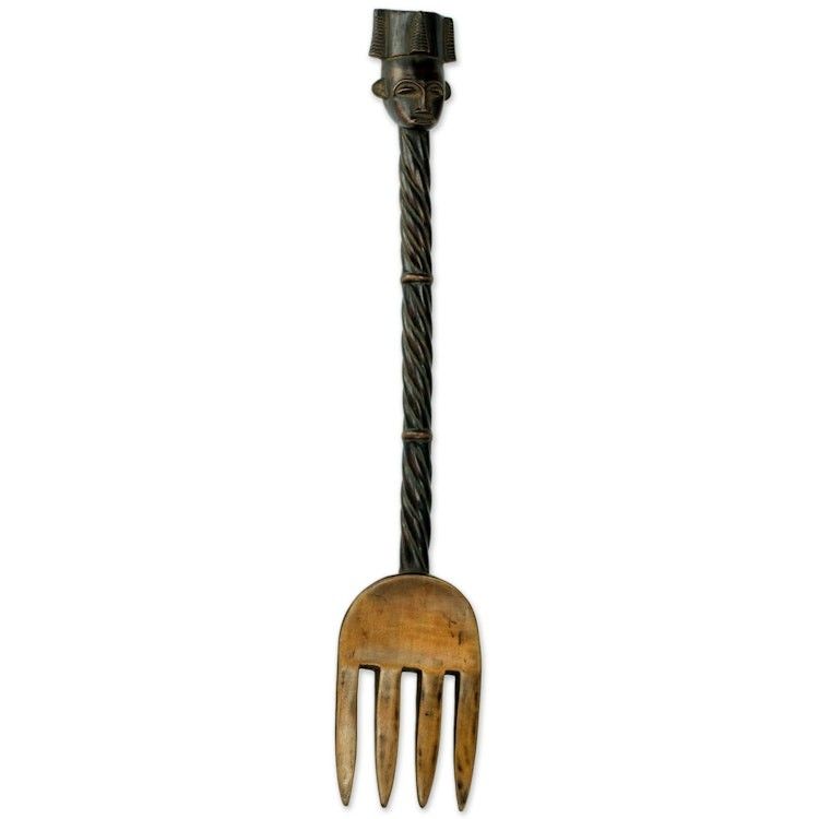 "Eating utensils are much more significant than they are given credit for. Ghanaian artisan Eva Asantewa Amakye brings food and the beauty of eating to our attention by creating this skillfully carved sese wood fork wall sculpture featuring a crowned head on the handle. Amakye calls it Ohene Attle, which means 'King's Fork' in the Twi language spoken by the Akan peoples of Ghana."