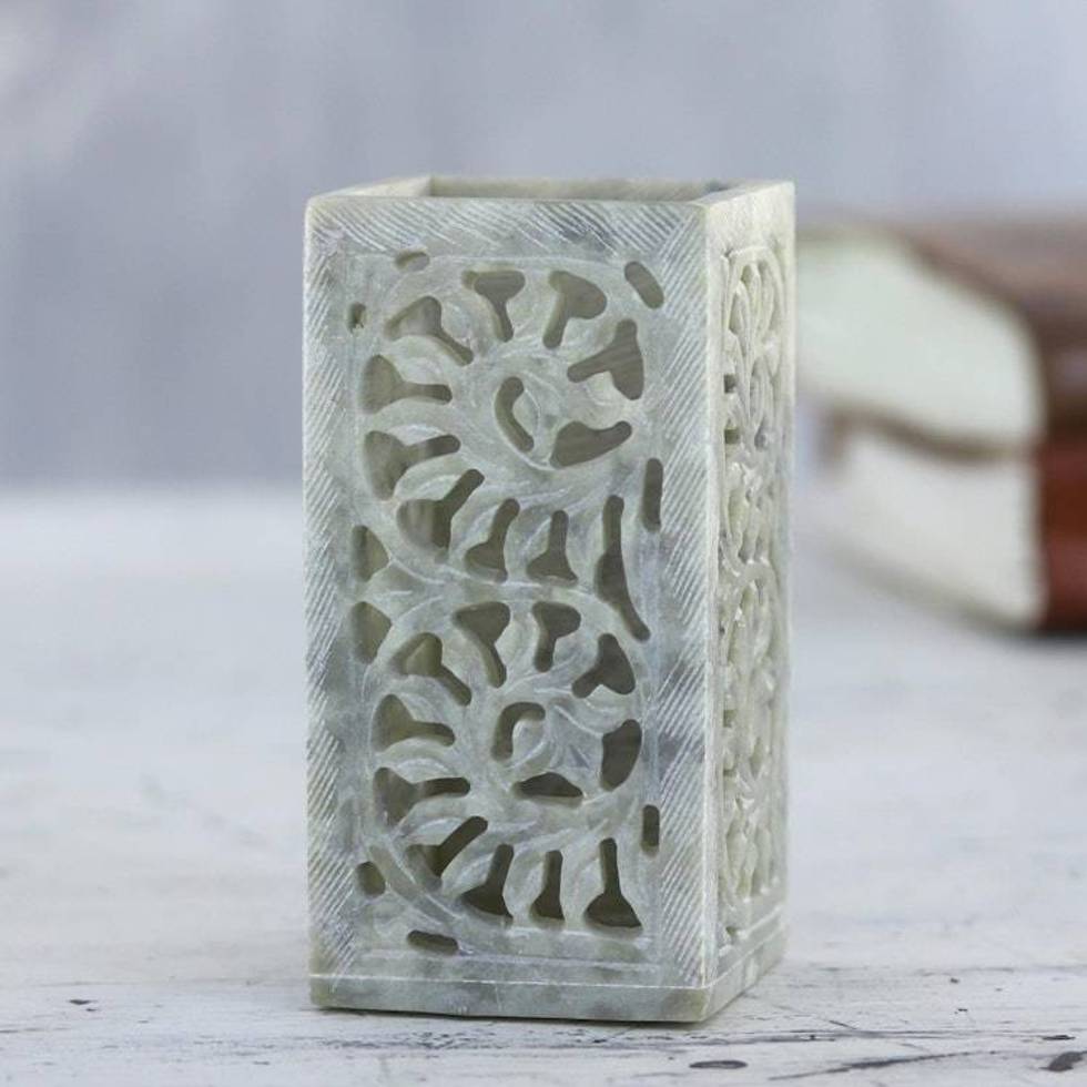 Hand Carved Soapstone Pen Holder from India 'Office Order' Item ID: 2676665186