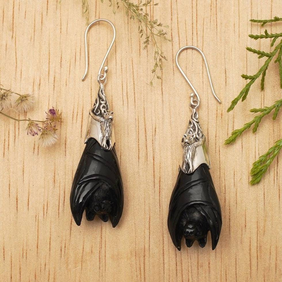 Hand-Carved Sterling Silver Bat Dangle Earrings in Black 'Dark Bats' Item ID: 2671612988