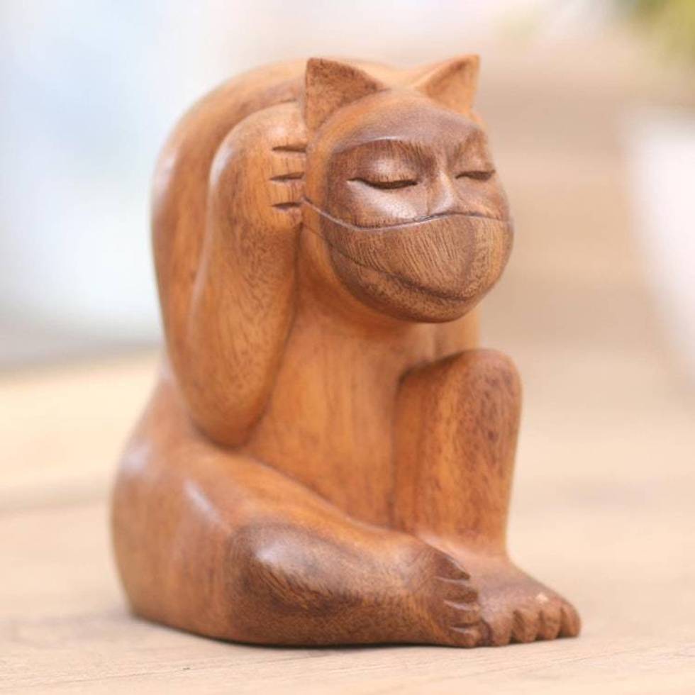 Hand Carved Suar Wood Cat Statuette 'Healthy Cat' Item ID: 2676667634