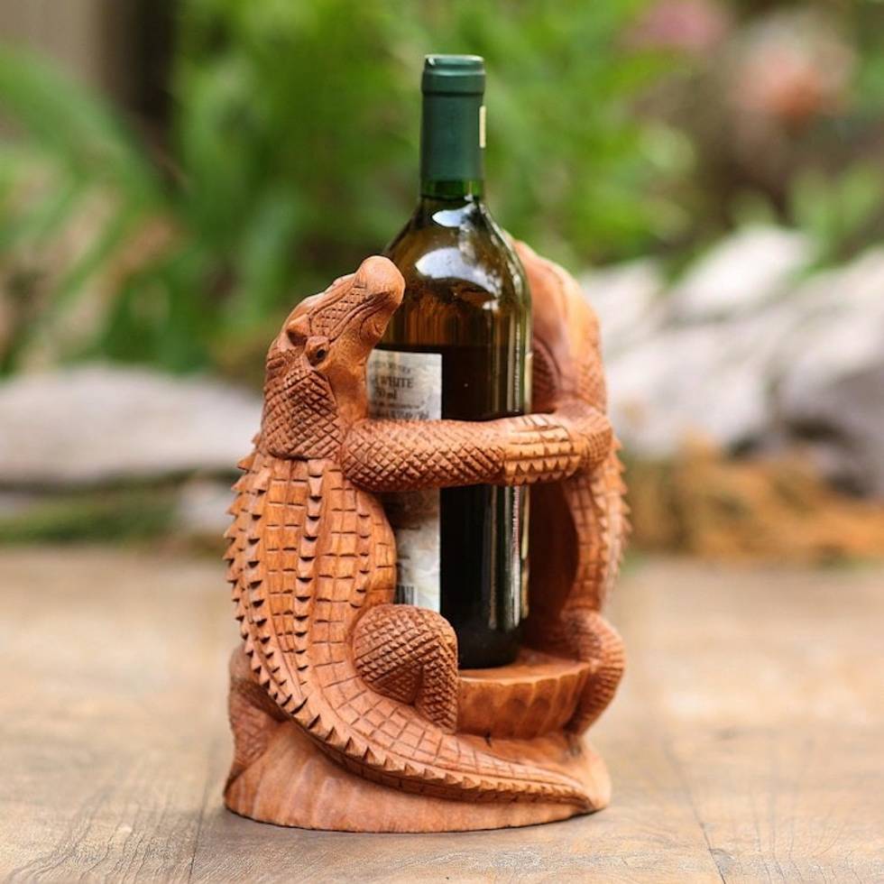 Hand Carved Suar Wood Crocodile Wine Holder 'Crocodile Embrace' Item ID: 2671746431