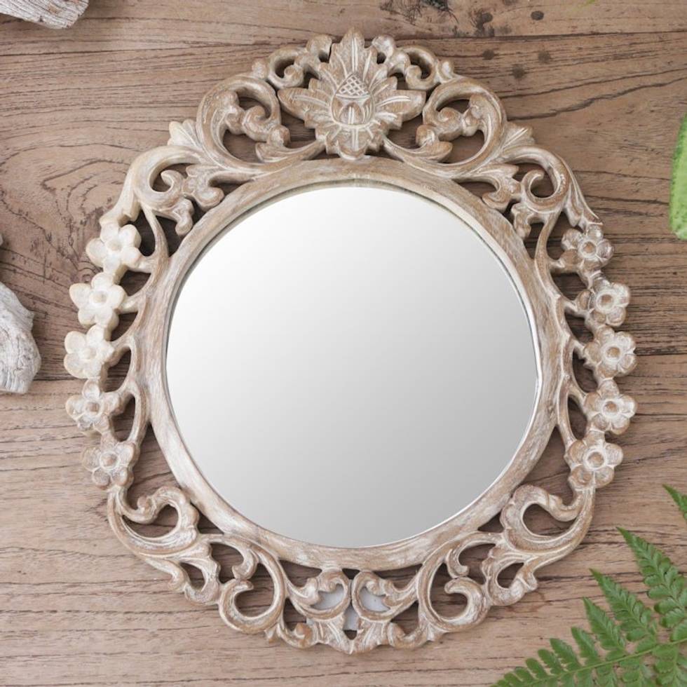 Hand Carved Suar Wood Floral Wall Mirror from Bali 'Gianyar Garden' Item ID: 2669891529
