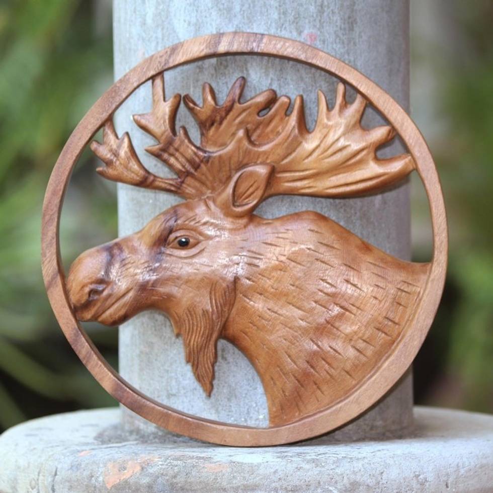 Hand Carved Suar Wood Moose Wall Panel 'Moose Portrait' Item ID: 2671736508