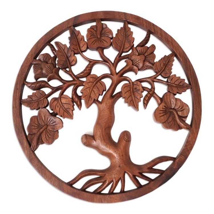 Hand-Carved Suar Wood Relief Panel of Hibiscus Tree 'Hibiscus Charm' Item ID: 2671763034