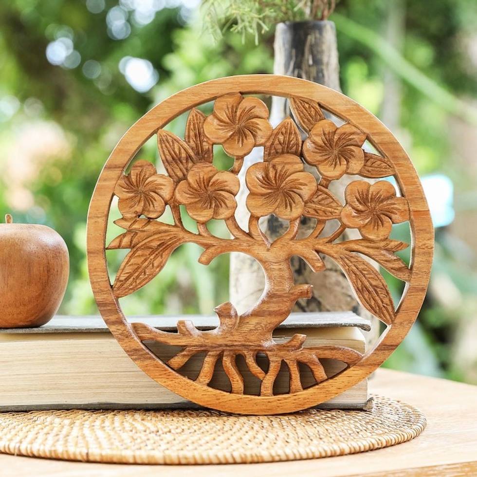 Hand-Carved Suar Wood Relief Panel of Tree and Flowers 'Frangipani Spring' Item ID: 2671763106