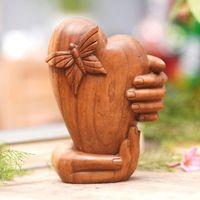 Hand-Carved Suar Wood Sculpture of Heart and Butterfly 'Love Butterfly' Item ID: 2671763299