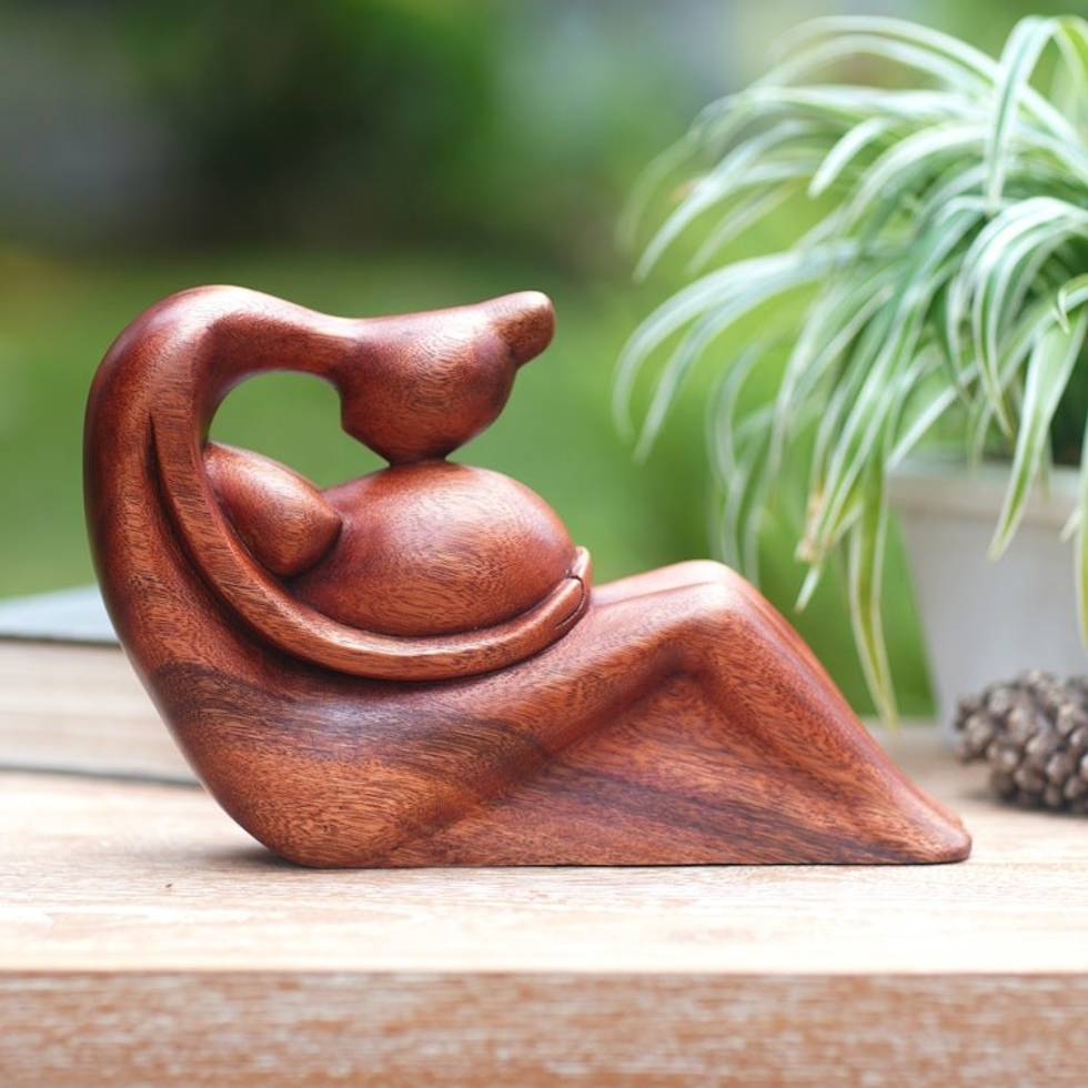 Hand-Carved Suar Wood Sculpture of Pregnant Woman 'Belly Kiss' Item ID: 2669891675