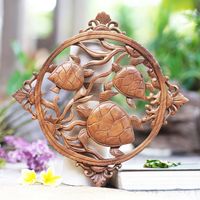 Hand-Carved Suar Wood Turtle-Themed Relief Panel from Bali 'Seaweed Turtles' Item ID: 2671733106