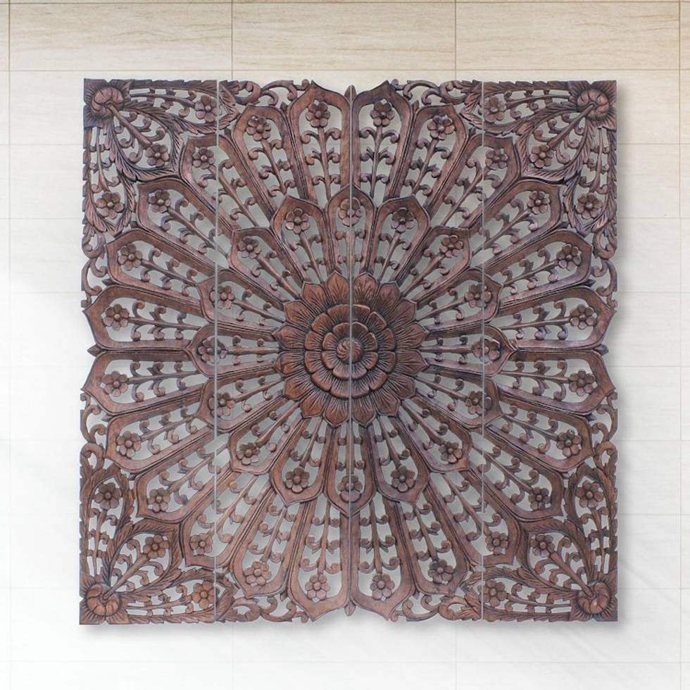 Hand Carved Teak Wood Relief Panels Set of 4 'Modern Lotus' Item ID: 2671799745