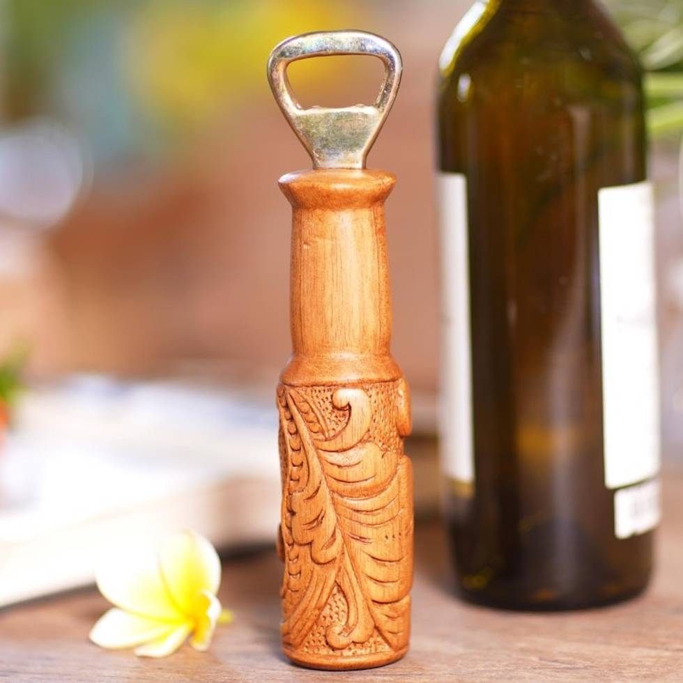 Hand Carved Wood Bottle Opener with Leaf Motif from Bali 'Bottles Up' Item ID: 2669891585