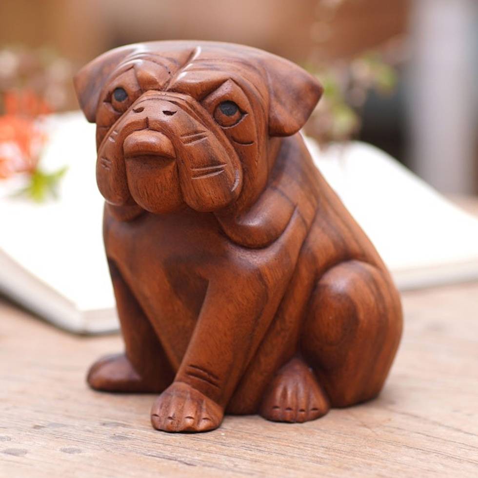 Hand Carved Wood Bulldog Puppy Sculpture from Bali 'Curious Bulldog' Item ID: 2671821756