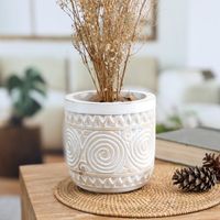 "A seamless blend of minimalist aesthetics and traditional Balinese design elements culminates in an exquisite home decor accent that promises to bring warmth and style to your space. This decorative vase designed by Citra is skillfully carved by hand from albesia wood and boasts intricate spiral and geometric motifs. The stunning distressed finish on the vase complemented by delicate white accents imbues the piece with character and makes it a unique addition to any interior design scheme."