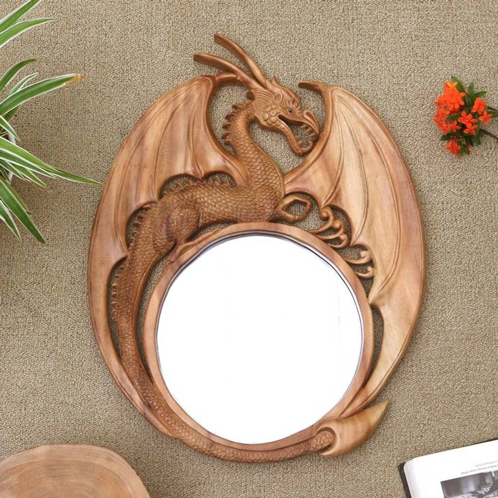 Hand-carved Wood Dragon Wall Mirror from Bali 'Mysterious Dragon' Item ID: 2671748267