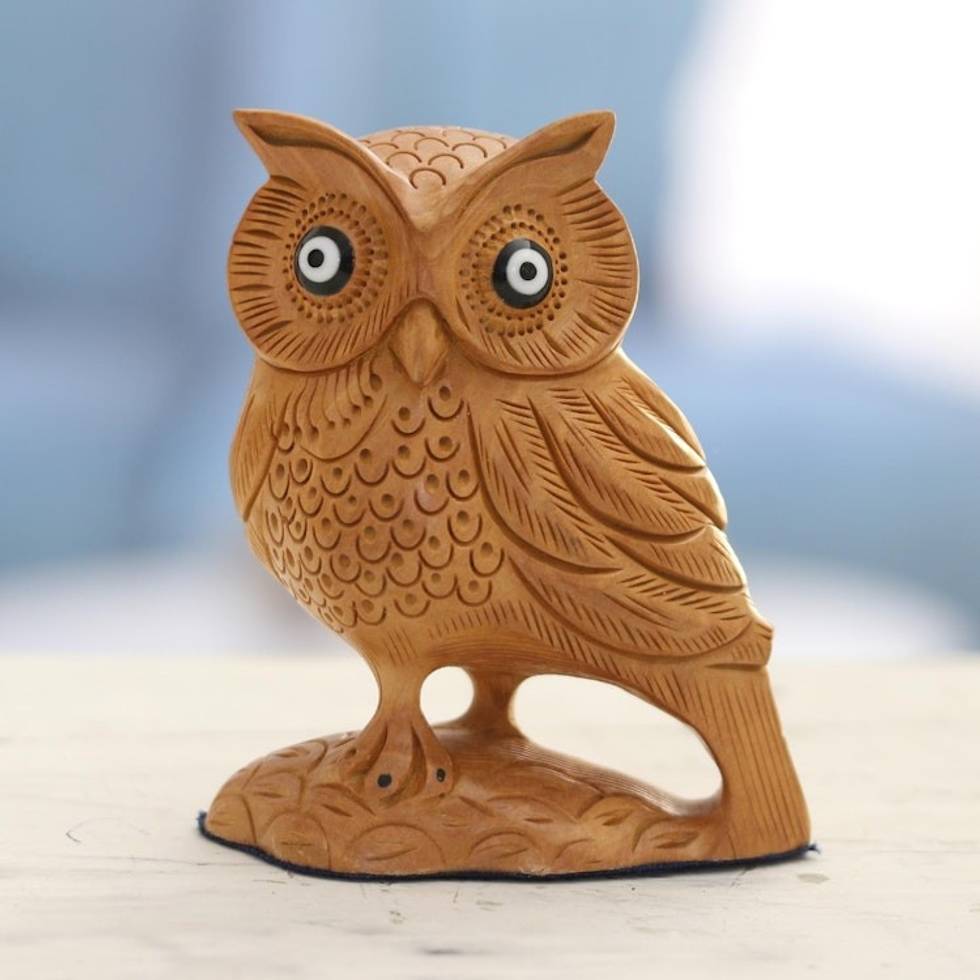 Hand-Carved Wood Figurine of An Owl from India 'Owl Glory' Item ID: 2671786564