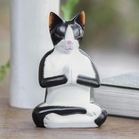 Hand Carved Wood Kitty Cat Meditation Sculpture 'Tuxedo Cat Meditates' Item ID: 2671744749