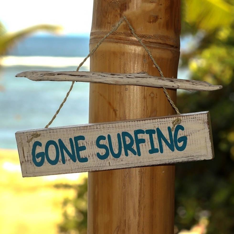 Hand Carved Wood Nautical Sign with Grass Cord Indonesia 'Gone Surfing' Item ID: 2671701939