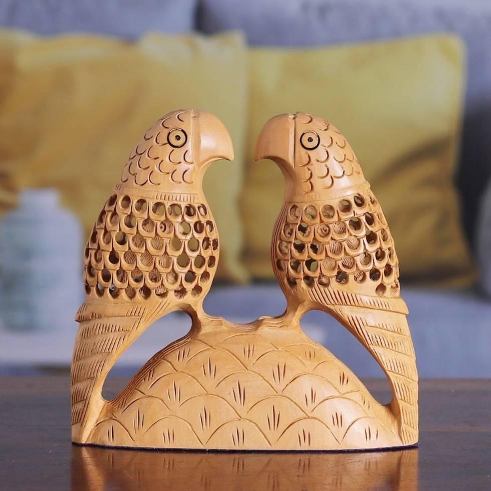 Hand Carved Wood Parrot Sculpture from India 'Parrot Hearts' Item ID: 2671790212