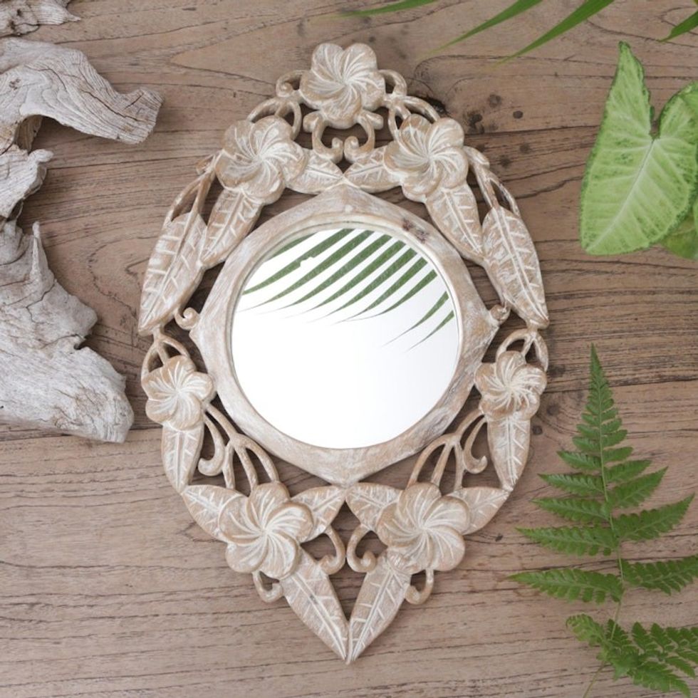 Hand-Carved Wood Round Floral Wall Mirror from Bali 'Jembrana Frangipani' Item ID: 2671702326