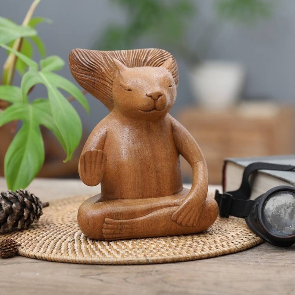 Hand-Carved Wood Sculpture of Meditating Squirrel from Bali 'Blessing Squirrel' Item ID: 2671764431