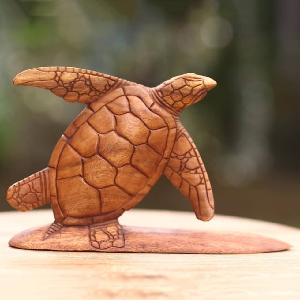 Hand Carved Wood Sculpture Turtle on Surf Board from Bali 'Surfer Turtle' Item ID: 2671702705