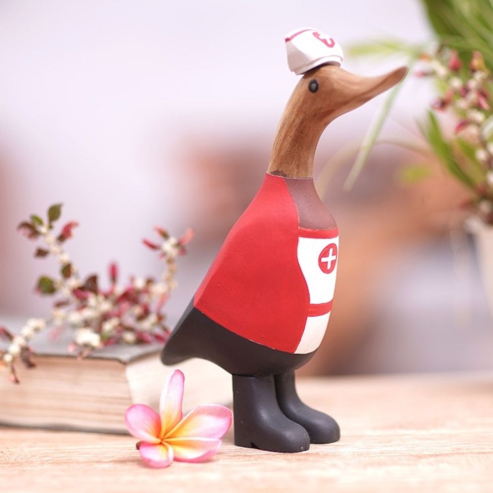 Hand-Crafted Bamboo Root and Teak Wood Nurse Duck Figurine 'Nurse Duckling in Red' Item ID: 2671747782