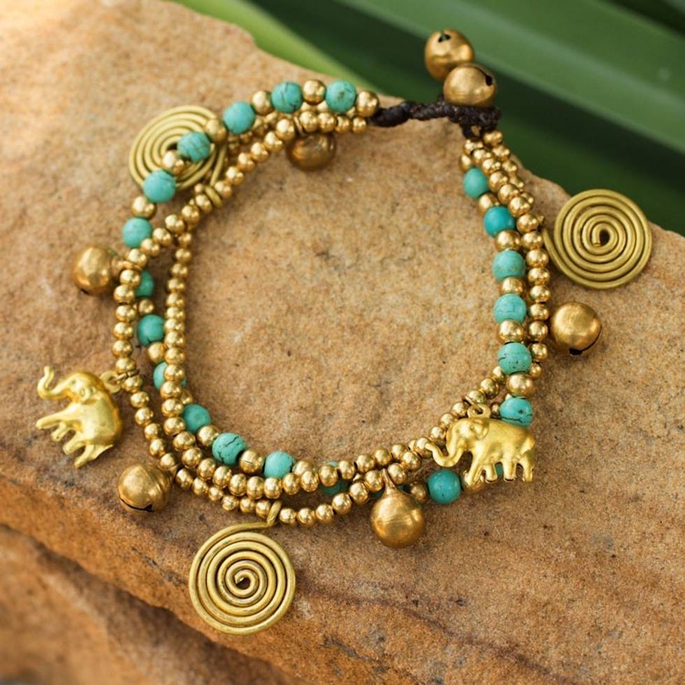 Hand Crafted Brass Charm Bracelet from Thailand 'Blue Siam Elephants' Item ID: 2671803110
